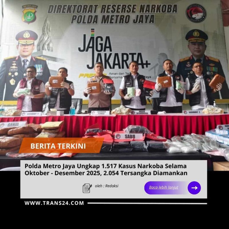 Jakarta 22-12-2025, // trans24.id PROPAM NEWS TV – Direktorat Reserse Narkoba Polda Metro Jaya mengungkap 1.517 kasus narkoba selama periode Oktober hingga Desember 2025. Dari pengungkapan tersebut, polisi mengamankan 2.054 tersangka dengan barang bukti narkotika seberat 387,34 kilogram.