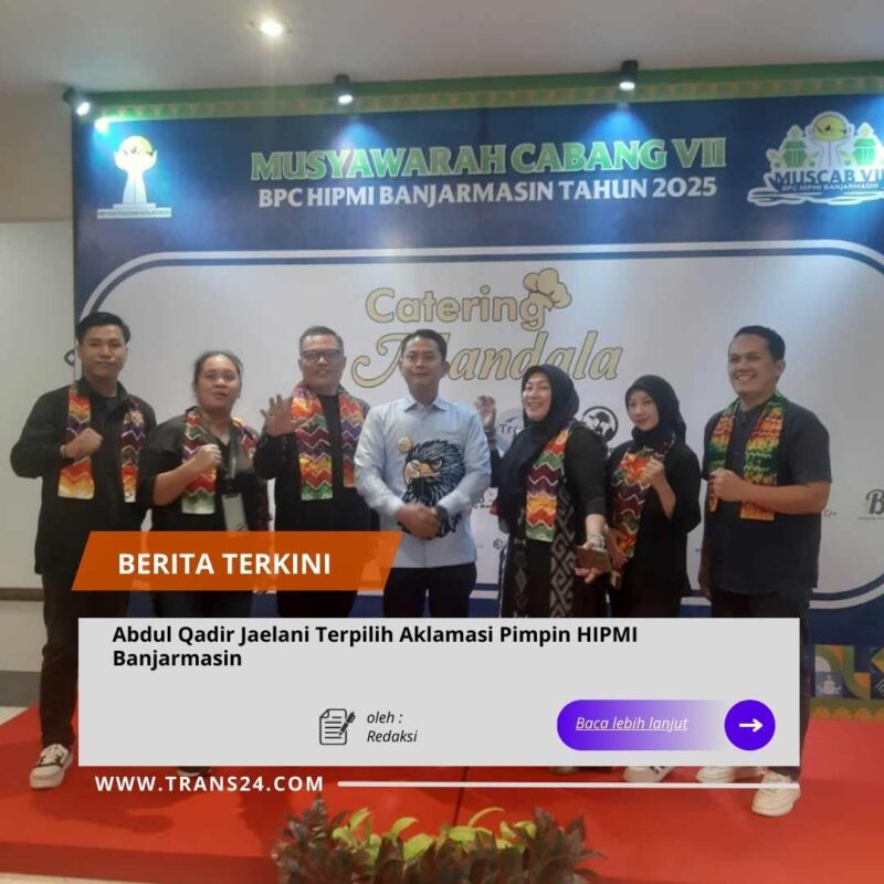 KALSEL//trans24.id Muscab VII HIPMI Banjarmasin resmi digelar, Abdul Qadir Jaelani terpilih sebagai Ketua Umum BPC HIPMI Kota Banjarmasin periode 2025-2028 melalui mekanisme aklamasi. Pelantikan kepengurusan baru ini menandai babak baru kepemimpinan HIPMI Banjarmasin.