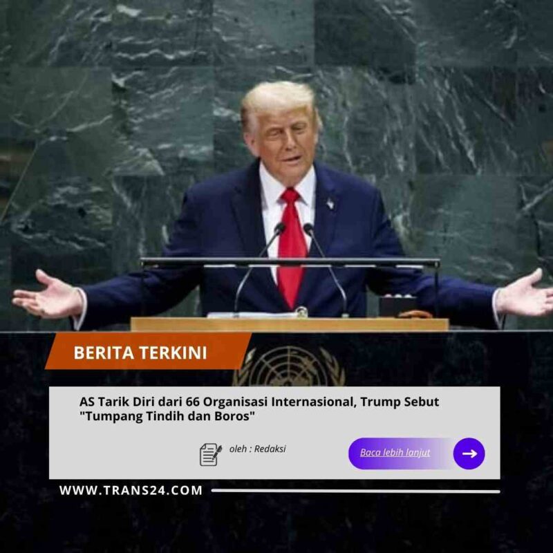 Presiden Amerika Serikat //trans24.id (AS) Donald Trump menandatangani perintah eksekutif pada Rabu (7/1) untuk menghentikan dukungan AS terhadap 66 organisasi, badan, dan komisi internasional, termasuk sejumlah lembaga di bawah Perserikatan Bangsa-Bangsa (PBB). Kebijakan ini menegaskan langkah AS semakin menjauh dari kerja sama global.