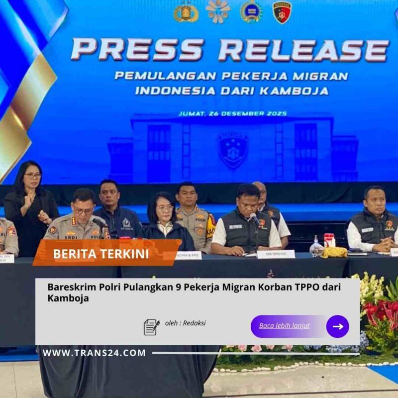 Jakarta//trans24.id — Bareskrim Polri melalui Direktorat Tindak Pidana Tertentu (Dittipidter) berhasil memulangkan sembilan pekerja migran Indonesia yang menjadi korban dugaan Tindak Pidana Perdagangan Orang (TPPO) dari Kamboja. Para korban tiba di Tanah Air pada Jumat, 26 Desember 2025, setelah melalui proses penyelidikan dan koordinasi lintas negara.