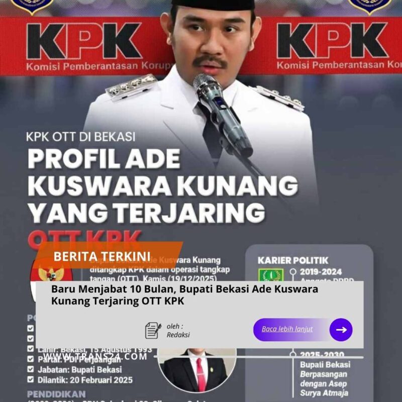 BEKASI//trans24.id – Kabar mengejutkan datang dari Gedung Merah Putih. Komisi Pemberantasan Korupsi (KPK) dikabarkan melakukan Operasi Tangkap Tangan (OTT) di wilayah Kabupaten Bekasi pada Kamis (19/12/2025). Dalam operasi senyap tersebut, Bupati Bekasi, Ade Kuswara Kunang, dilaporkan menjadi salah satu pihak yang diamankan.