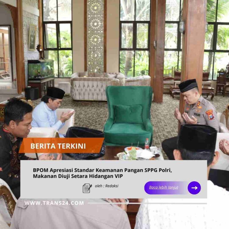 Jakarta, // trans24.id //— Kepala Badan Pengawas Obat dan Makanan (BPOM) Republik Indonesia, Prof. dr. Taruna Ikrar, M.Biomed., Ph.D., memberikan apresiasi tinggi terhadap penerapan standar keamanan pangan di Satuan Pelayanan Pemenuhan Gizi (SPPG) Polri. Hal tersebut disampaikan saat melakukan kunjungan dan pengecekan langsung terhadap proses pengolahan makanan bergizi gratis yang disiapkan di dapur SPPG Polri Cipinang.