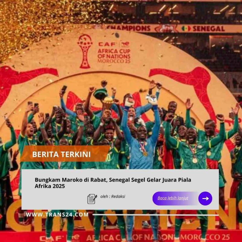 Rabat, // trans24.id //- Timnas Senegal menjuarai Piala Afrika 2025 setelah menekuk Timnas Maroko dengan skor 1-0 pada pertandingan final di Stadion Prince Moulay Abdellah, Rabat, Maroko, Minggu waktu setempat. Gol semata wayang itu dicetak Pape Gueye pada babak tambahan pertama di menit 94.