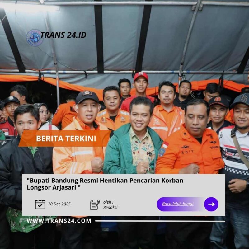 BANDUNG//trans24.id – Bupati Bandung Dadang Supriatna resmi menghentikan pencarian tiga korban longsor di Kampung Condong RT 06-07/RW 09 Desa Wargaluyu Kecamatan Arjasari Kabupaten Bandung, Kamis (11/12/2025) sore.