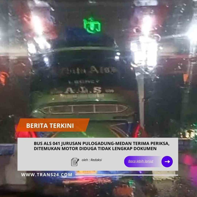 Serang Banten //trans24.id Armada Bus ALS dengan nomor identifikasi 041 yang sedang melayani rute Pulogadung–Medan harus menerima pemeriksaan dari Tim Reserse Mobil (Resmob) Polda Banten pada Senin malam. Dalam pemeriksaan tersebut, petugas menemukan beberapa unit sepeda motor yang diduga tidak memiliki surat-surat resmi lengkap, yang akan melalui jalur pelabuhan Merak–Bakauheni untuk menuju Pulau Sumatra.