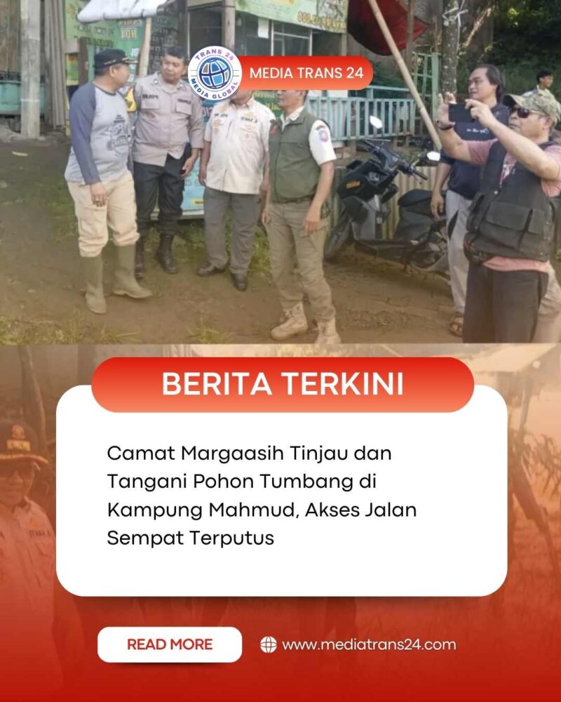 Margaasih//trans24.id – 5 Desember 2025 – Akibat hujan deras dan angin kencang yang melanda wilayah Margaasih, sebuah pohon tumbang menutupi akses jalan menuju Kampung Mahmud, Desa Mekarrahayu. Camat Margaasih, didampingi Kasi Trantibum, anggota Satpol PP, dan Linmas Kecamatan Margaasih, segera turun tangan meninjau dan membantu penanganan pohon tumbang tersebut.