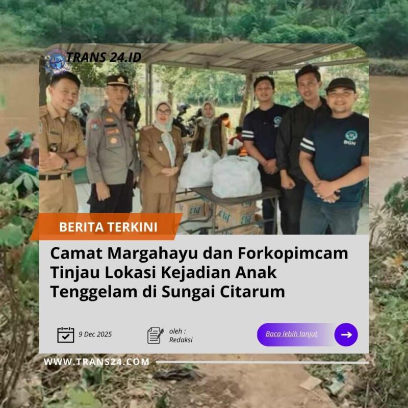 Margahayu//trans24.id –  9 Desember 2025 — Pagi itu suasana di bantaran Sungai Citarum tampak hening namun sarat harapan. Petugas SAR, relawan, dan unsur aparat berdiri menyisir aliran sungai, menatap setiap sudut permukaan air dengan penuh kehati-hatian. Di tengah suasana yang berat itu, Camat Margahayu, Hj. Tatti Suharyati, S.H., M.Si, bersama jajaran Forkopimcam Margahayu, hadir mendampingi Kapolresta Bandung dalam peninjauan hari kedua upaya pencarian anak yang dilaporkan tenggelam.