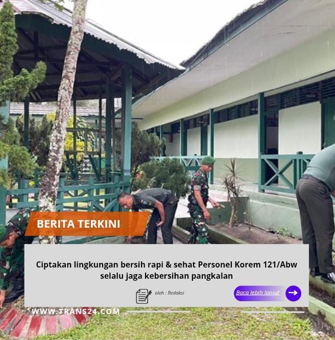 SINTANG, // trans24.id //- Dalam upaya menciptakan lingkungan kerja yang bersih, rapi, dan sehat, personel Korem 121/Abw melaksanakan kegiatan kebersihan lingkungan secara rutin di sekitar Markas Korem 121/Abw, Rabu (4/2/2026).