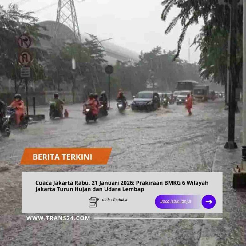 Jakarta, // Trans24.id //-Badan Meteorologi, Klimatologi, dan Geofisika (BMKG) memprakirakan seluruh wilayah DKI Jakarta akan diguyur hujan ringan pada Rabu, 20 Januari 2026.
