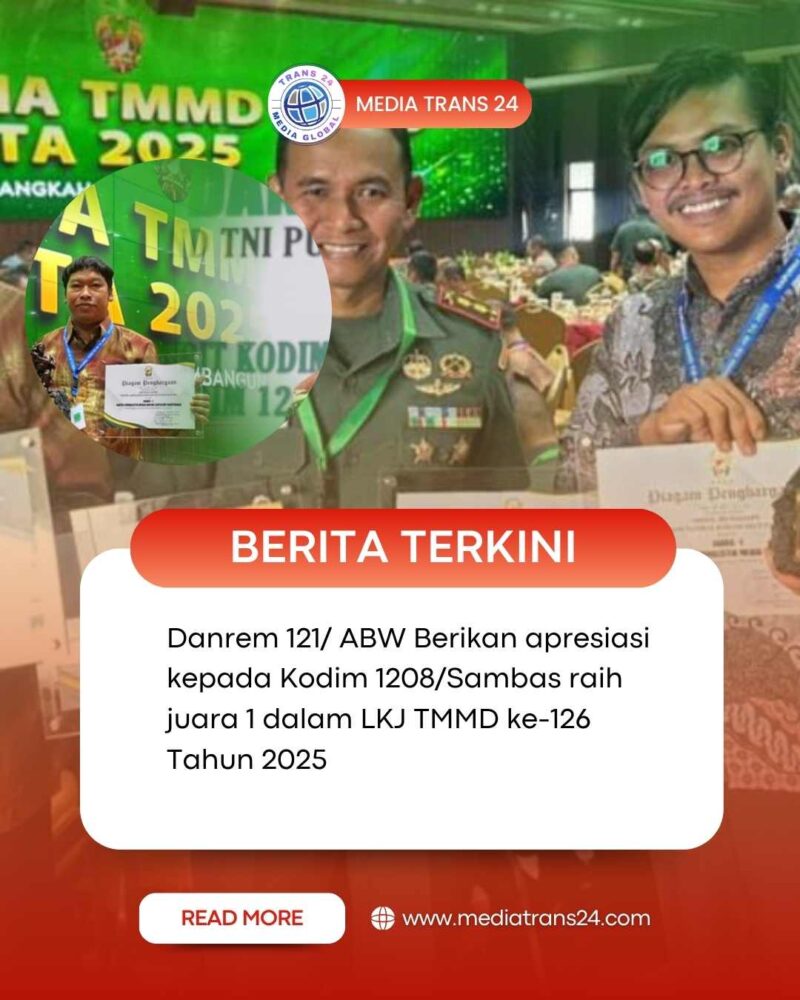 SINTANG//trans24.id – Danrem 121/Abw Brigjen TNI Purnomosidi, S.I.P., M.A.P., M.Han., memberikan apresiasi kepada Dansatgas TMMD Kodim 1208/Sambas Letkol Inf Dwiyanto Kusumo dan 2 orang awak media yang meraih juara 1 dalam Lomba Karya Jurnalistik TMMD ke-126 Tahun 2025 mewakili Kodim 1208/Sambas.