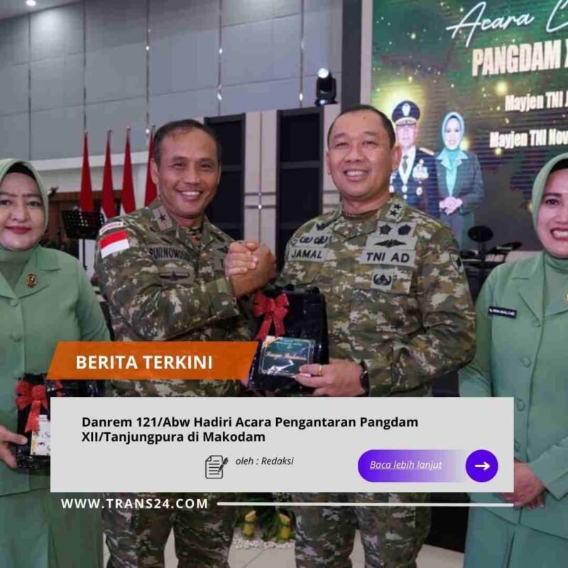 PONTIANAK, // trans24.id // – Danrem 121/Abw Brigjen TNI Purnomosidi, S.I.P., M.A.P., M.Han., bersama Ketua Koorcab Rem 121 PD XII/Tanjungpura, Ny. Debby Purnomosidi, hadiri acara pengantaran Pangdam XII/Tanjungpura Mayjen TNI Jamallulael, S.Sos., M.Si. Kegiatan tersebut berlangsung khidmat, bertempat di Markas Komando Daerah Militer (Makodam) XII/Tanjungpura, Sabtu (17/01/2026).