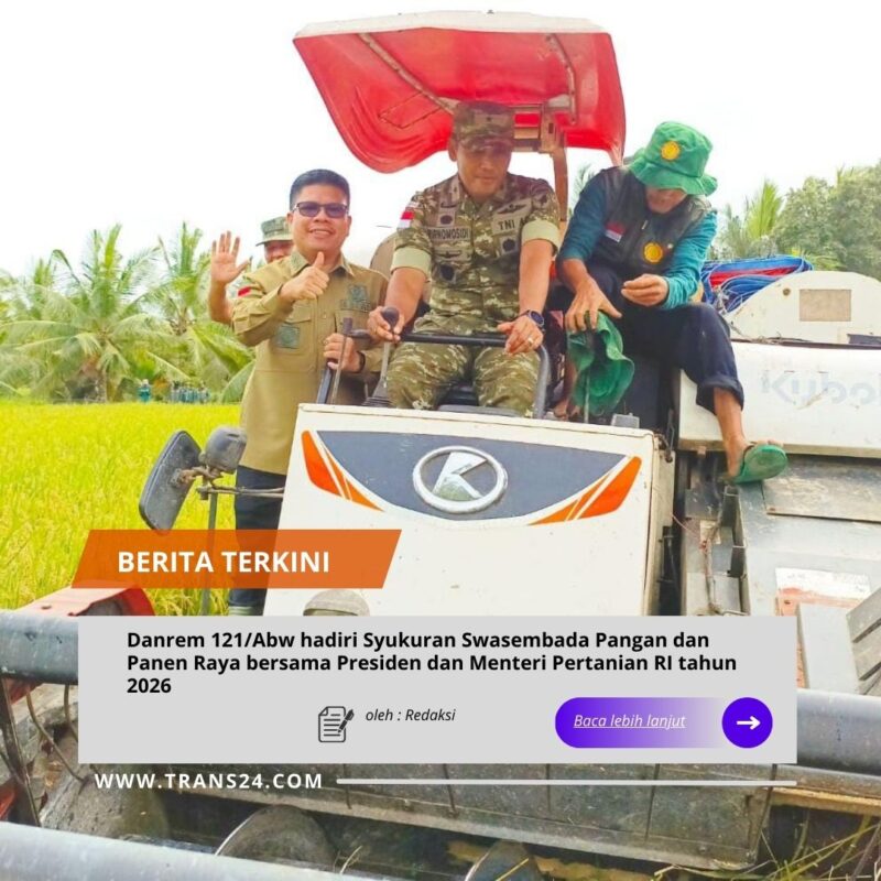 SAMBAS //trans24.idDanrem 121/Abw Brigjen TNI Purnomosidi, S.I.P., M.A.P., M.Han., didampingi Kasiter Kasrem 121/Abw Kolonel Inf Negy Kuntagina dan Dandim 1208/Sbs Letkol Inf Dwiyanto Kosumo, M.A.P., menghadiri acara Syukuran Swasembada Pangan dan Panen Raya bersama Menteri Pertanian Republik Indonesia, bertempat di Gapoktan Cahaya Baru, Desa Parit Baru, Kecamatan Salatiga, Kabupaten Sambas, Kalimantan Barat, Rabu (07/12/2026).