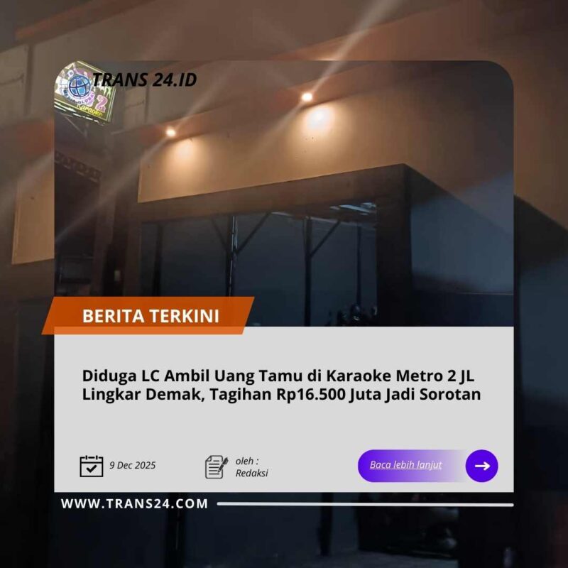 Demak//trans24.id — November 2025 Sebuah dugaan tindakan tidak menyenangkan terjadi di Karaoke Metro 2 Lingkar Demak Jawa Tengah. Seorang tamu berinisial R.Z mengaku kehilangan uang setelah selesai berjoget dan bernyanyi bersama seorang Ladies Companion (LC) berinisial M.