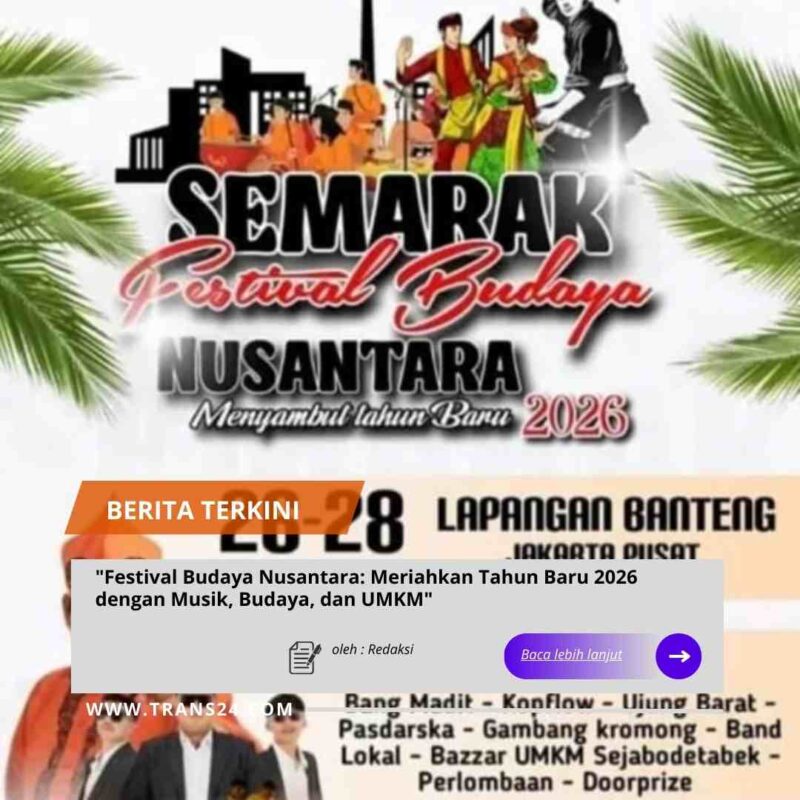 JAKPUS//trans24.id – Festival Budaya Nusantara akan digelar di Lapangan Banteng, Jakarta Pusat, dari tanggal 26-28 Desember 2025. Acara ini akan dimeriahkan oleh Bang Madit, Kopflow, Ujung Barat, dan artis lainnya, serta bazar UMKM se-Jabodetabek.