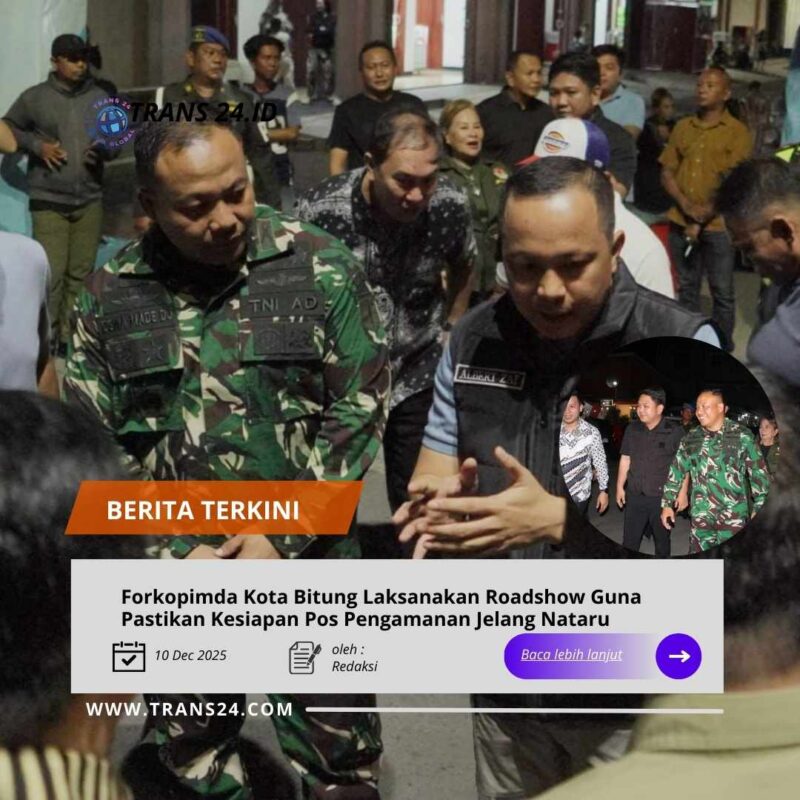 BITUNG//trans24.id — Bertempat di Lobby Kantor Walikota Bitung Kel. Bitung Barat Satu Kec. Maesa Kota Bitung, Forum Koordinasi Pimpinan Daerah (Forkopimda) Kota Bitung mengadakan pertemuan bersama Forum Lintas Sektoral Keamanan Ketentraman dan Ketertiban Masyarakat Kota Bitung untuk melaksanakan kegiatan Roadshow mengecek langsung kesiapan pos pengamanan jelang Nataru di Kota Bitung. Sabtu, (13/12/2025) Malam.