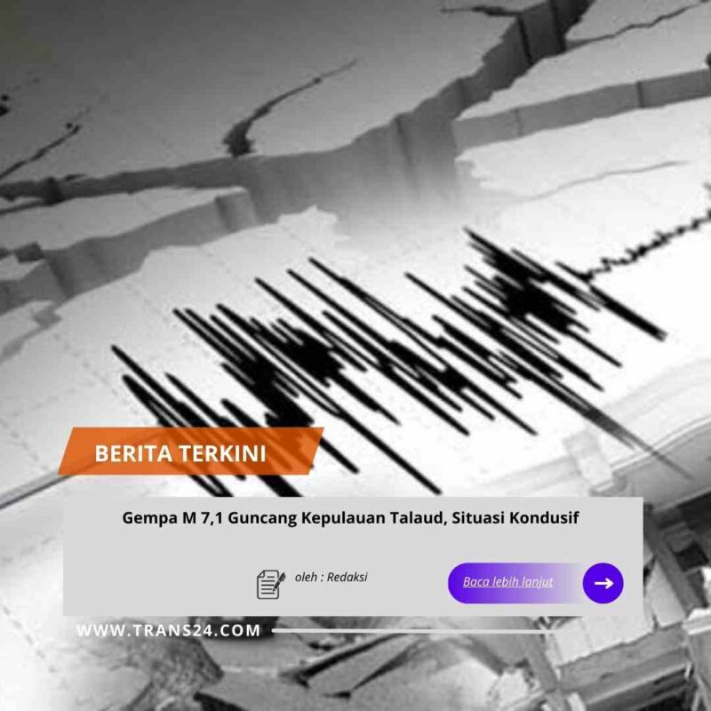 Banjarbaru //trans24.id Badan Nasional Penanggulangan Bencana (BNPB) memastikan kondisi di Kabupaten Kepulauan Talaud, Sulawesi Utara, relatif kondusif usai diguncang gempa bumi magnitudo (M) 7,1. Hingga saat ini, tidak ada laporan korban jiwa maupun luka berat akibat peristiwa tersebut.