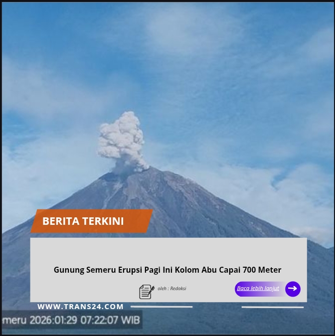 Lumajang, // trans24.id //- Gunung Semeru yang berada di perbatasan Kabupaten Lumajang dan Malang, Jawa Timur, kembali erupsi pada Kamis pagi, 29 Januari 2026. Letusan tercatat dengan tinggi kolom abu mencapai 700 meter di atas puncak.