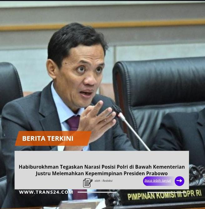 Jakarta, // trans24.id // – Ketua Komisi III DPR RI Habiburokhman menyatakan bahwa narasi yang berkembang belakangan mengenai wacana menempatkan Polri di bawah kementerian bukan hanya tidak tepat, tetapi berpotensi melemahkan kekuasaan Presiden Prabowo Subianto sebagai pemegang otoritas tertinggi institusi kepolisian nasional.