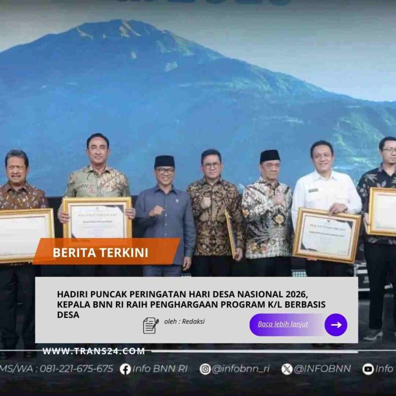 JAWA TENGAH,//trans24.id//-Badan Narkotika Nasional (BNN) menegaskan komitmennya dalam mendukung pembangunan desa berdaya, aman, dan bebas narkoba pada Puncak Peringatan Hari Desa Nasional yang diperingati 15 Januari 2026. Puncak peringatan dengan mengangkat tema “Bangun Desa, Bangun Indonesia, Desa Terdepan untuk Indonesia” ini digelar di Lapangan Desa Butuh, Kecamatan Mojosongo, Kabupaten Boyolali, Jawa Tengah.