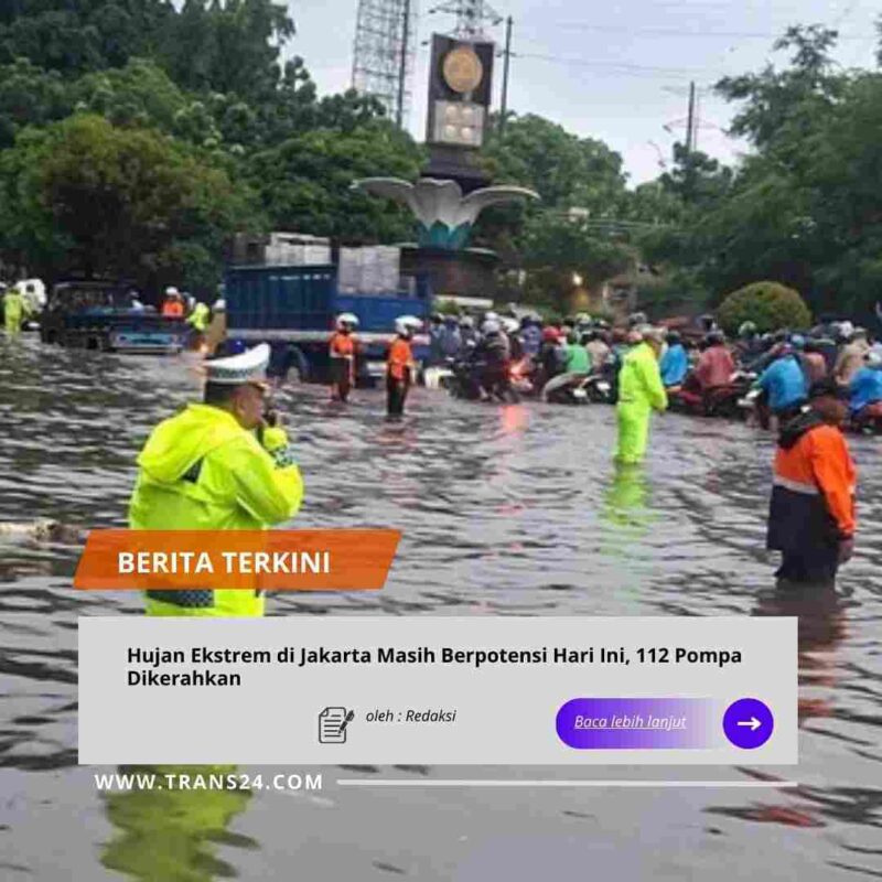 Jakarta, // trans24.id // – Badan Penanggulangan Bencana Daerah (BPBD) DKI Jakarta menginformasikan potensi hujan lebat masih berlangsung hari ini. Dinas Sumber Daya Air (SDA) DKI Jakarta mengerahkan sebanyak 112 unit pompa mobile untuk memitigasi banjir di titik-titik rawan.