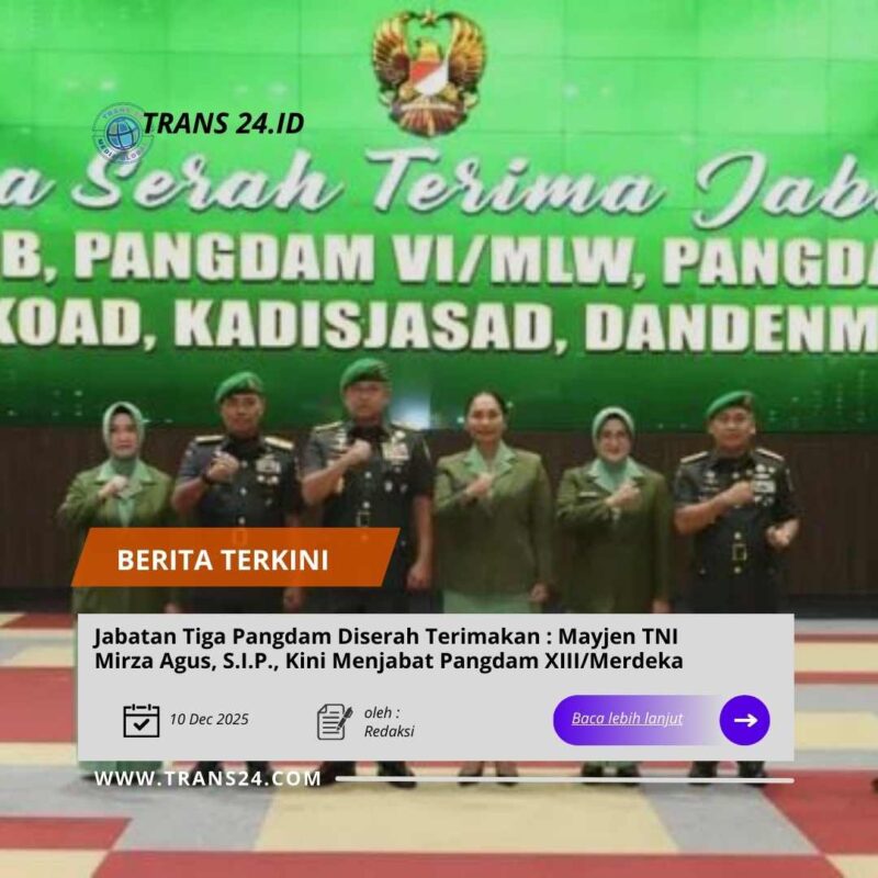 JAKARTA//trans24.id – Pergantian pucuk pimpinan Komando Daerah Militer ( KODAM ) kembali terjadi di tubuh TNI AD. Kepala Staf Angkatan Darat Jenderal TNI Maruli Simanjuntak, M.Sc., secara resmi memimpin acara Serah Terima Jabatan tiga Panglima Komando Daerah Militer (Pangdam), diantaranya adalah Pangdam XIII/Merdeka yang sebelumnya dijabat oleh Mayjen TNI Suhardi saat ini resmi diserahterimakan kepada Mayjen TNI Mirza Agus, S.I.P., di Markas Besar Angkatan Darat ( MABESAD ). Kamis, ( 11/12/2025 ).
