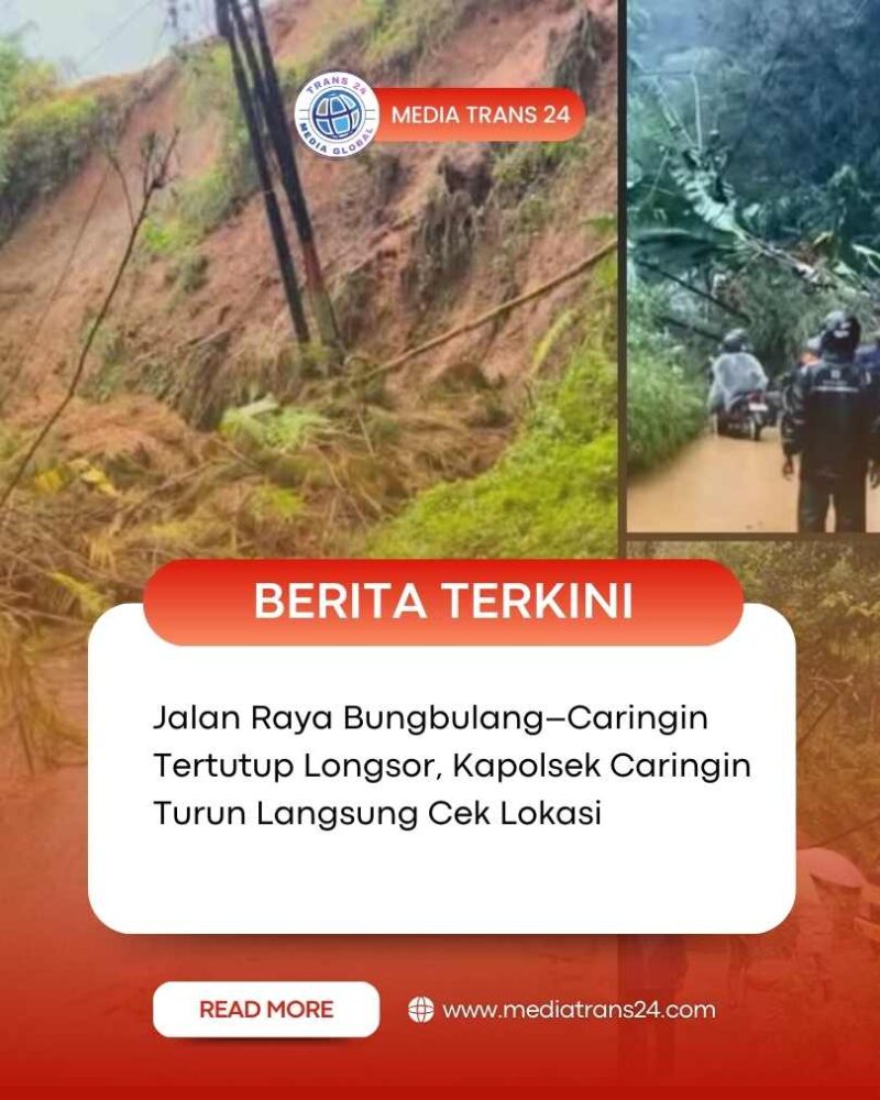 Garut//trans24.id – Hujan deras yang mengguyur wilayah Kecamatan Caringin sejak siang hari menyebabkan terjadinya bencana alam longsor di Jl. Raya Bungbulang–Caringin, tepatnya di Kp. Cisarua RT 02 RW 05, Desa Sukarame, pada Rabu (03/12/2025) sekitar pukul 19.00 Wib.
