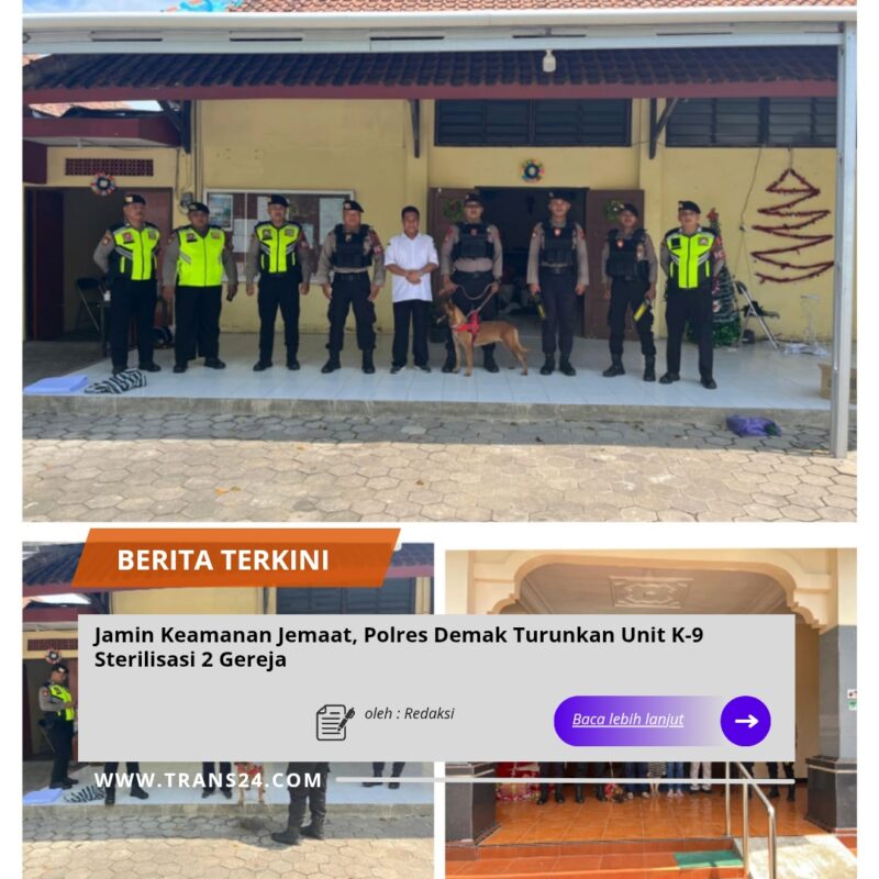 Demak//trans24.id – Kepolisian Resor (Polres) Demak, Jawa Tengah, melaksanakan sterilisasi sejumlah gereja dan rumah ibadah di wilayah Kabupaten Demak, Rabu (24/12/2025). Kegiatan tersebut dilakukan dalam rangka mendukung pelaksanaan Operasi Lilin Candi 2025 guna memastikan perayaan Hari Raya Natal berjalan aman dan kondusif.