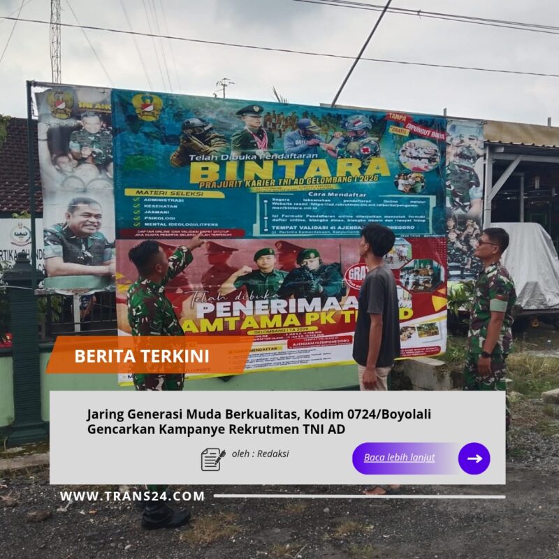 Boyolali, //trans24— Jajaran Koramil di bawah naungan Kodim 0724/Boyolali gencar melaksanakan kampanye rekrutmen Tamtama dan Bintara TNI Angkatan Darat dengan memasang spanduk serta membagikan brosur dan poster kepada masyarakat, (17/01/2026).