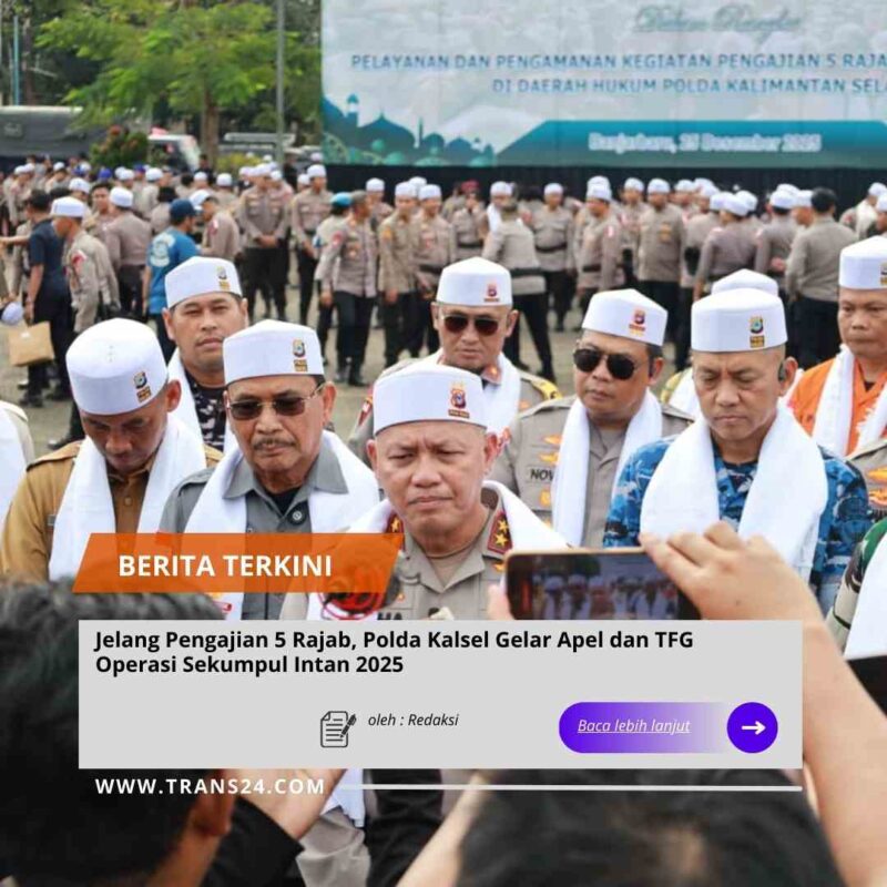 BANJARBARU//trans24.id – Menjelang pelaksanaan pengajian rutin memperingati 5 Rajab 1447 Hijriah, Kepolisian Daerah Kalimantan Selatan (Polda Kalsel) menggelar Apel Gelar Pasukan dan Tactical Floor Game (TFG) Operasi Sekumpul Intan 2025. Kegiatan ini digelar di Lapangan Murjani Banjarbaru, Kamis (25/12/2025) sore.