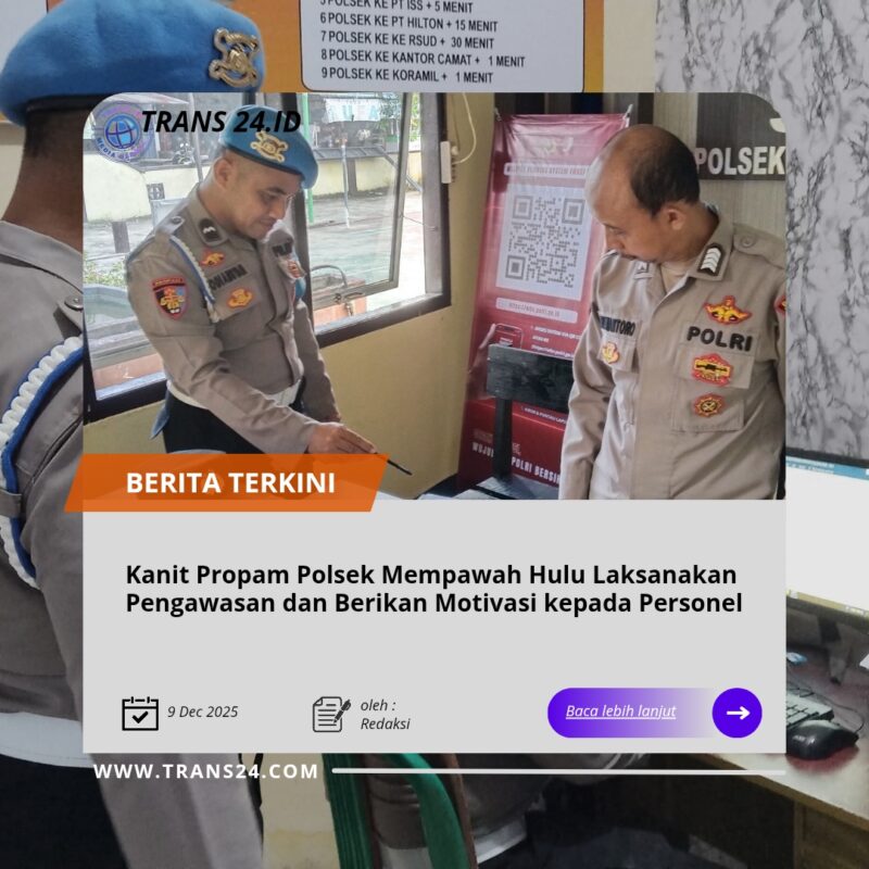 MEMPAWAH HULU, LANDAK//trans24.id – Kanit Propam Polsek Mempawah Hulu Aipda Rodiansyah melaksanakan kegiatan pengawasan terhadap seluruh personel Polsek Mempawah Hulu dalam rangka memastikan kedisiplinan, profesionalisme, serta kualitas pelayanan kepada masyarakat. Selasa, ( 09/12/25 )
