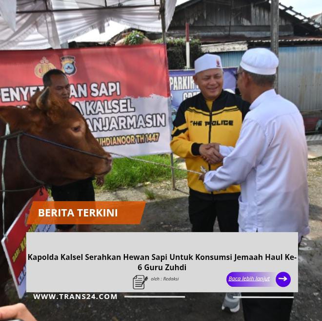 Kapolda Kalimantan Selatan, // trans24.id //-Irjen Pol Rosyanto Yudha Hermawan, S.I.K., S.H., M.H., secara simbolis menyerahkan hewan sapi dalam rangkaian acara Haul ke-6 almarhum KH. Ahmad Zuhdianoor (Guru Zuhdi) tahun 1447 Hijriyah/2026 Masehi. Penyerahan dilaksanakan di Lapangan Parkir Kubah Guru Zuhdi, Kompleks Mesjid Jami Banjarmasin, pada Sabtu (7/2/2026) pagi.