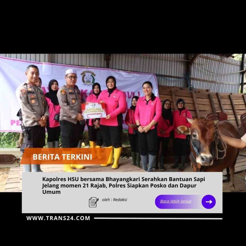 Kabupaten Hulu Sungai Utara//trans24.id Dalam rangka mendukung kelancaran dan kenyamanan pelaksanaan Momen 21 Rajab 1447 Hijriah, Kapolres Hulu Sungai Utara (HSU) AKBP Agus Nuryanto, S.I.K., M.Si. menyerahkan bantuan berupa hewan ternak kepada pihak keluarga dan Bhayangkari. Kegiatan tersebut dilaksanakan pada Sabtu, 10 Januari 2026, sekitar pukul 10.00 WITA, sebagai bentuk kepedulian Polri terhadap masyarakat serta dukungan terhadap kegiatan keagamaan berskala besar di wilayah Kabupaten Hulu Sungai Utara.