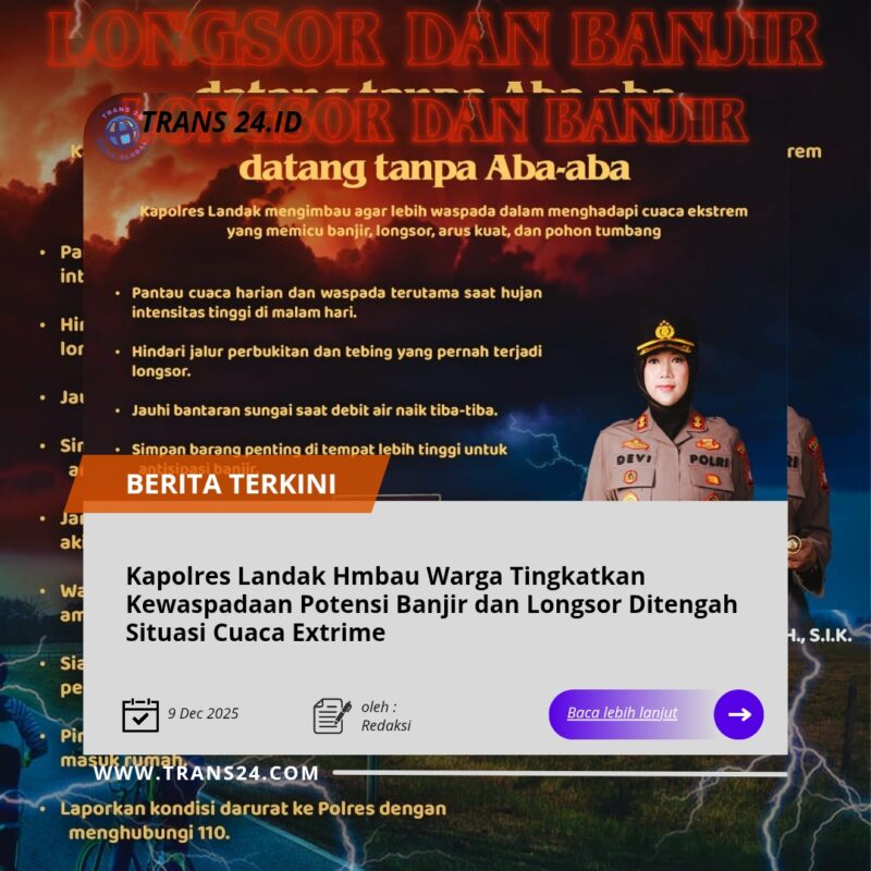 LANDAK//trans24.id – Untuk antisipasi terjadinya bencana, Kapolres Landak, AKBP Devi Ariantari, S.H., S.I.K., menghimbau seluruh masyarakat Kabupaten Landak untuk meningkatkan kewaspadaan menghadapi potensi cuaca ekstrem berupa banjir, tanah longsor, pohon tumbang, hingga angin kencang.