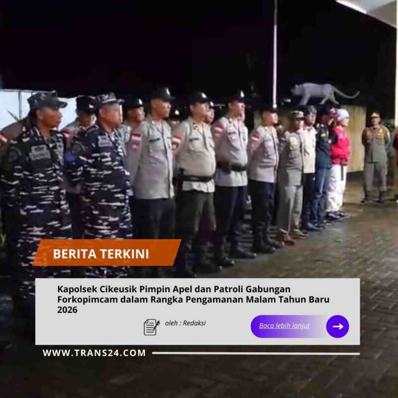 Pandeglang//trans24.id – Dalam rangka menciptakan situasi keamanan dan ketertiban masyarakat (kamtibmas) yang aman dan kondusif pada perayaan malam Tahun Baru 2026, Kapolsek Cikeusik Polres Pandeglang Iptu Dwi Hartanto, S.IP memimpin langsung kegiatan apel dan patroli gabungan Unsur Forkopimcam Kecamatan Cikeusik, Rabu malam (31/12/2025).