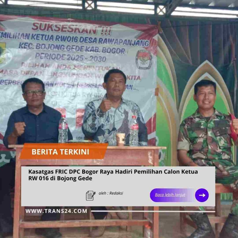 Bogor//trans24.id – 25 Desember 2025 – Kasatgas FRIC DPC Bogor Raya, Dedi Supiandi, menghadiri undangan pemilihan calon Ketua RW 016 Kampung Kelapa, Desa Rawa Panjang, Kecamatan Bojong Gede, Kabupaten Bogor. Kehadiran tersebut merupakan bentuk partisipasi aktif sebagai warga negara dalam proses demokrasi di tingkat lingkungan.