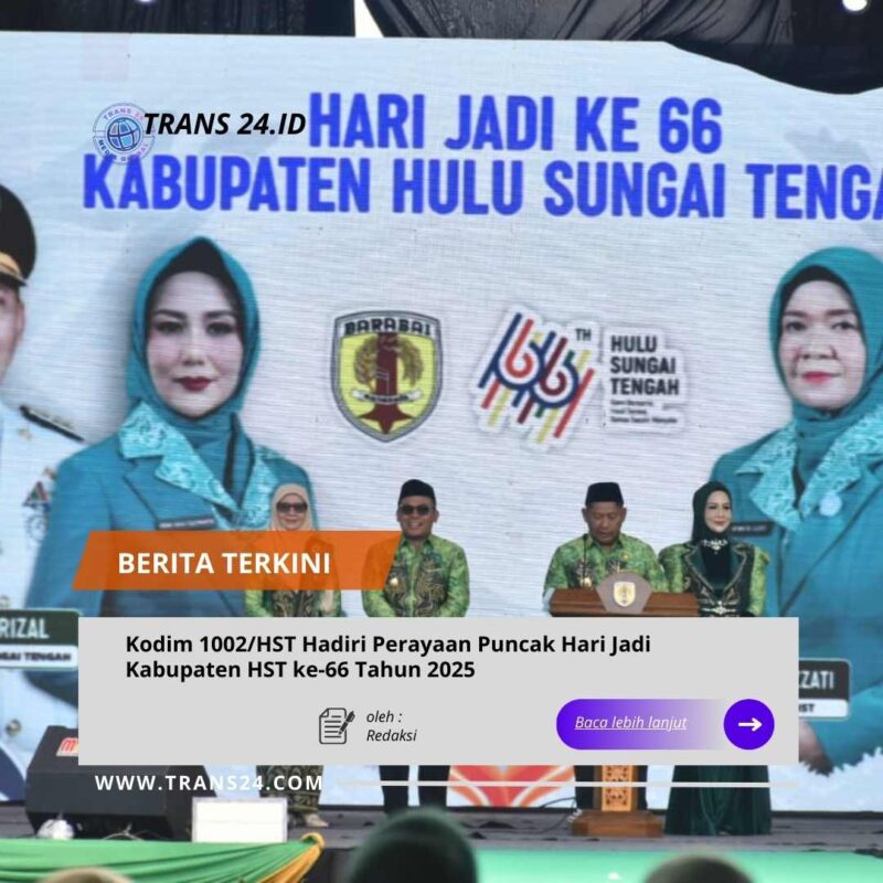 BARABAI//trans24.id  – Dandim 1002/Hulu Sungai Tengah Letkol Inf Ardiansyah Okta Putra Siregar bersama Ketua Persit Kartika Chandra Kirana Cabang XXV Dim 1002 Koorcab Rem 101 PD XXII/Tambun Bungai menghadiri perayaan puncak Hari Jadi Kabupaten Hulu Sungai Tengah (HST) ke-66 Tahun 2025 yang dilaksanakan di Lapangan Dwi Warna Barabai, Rabu (17/12/2025).
