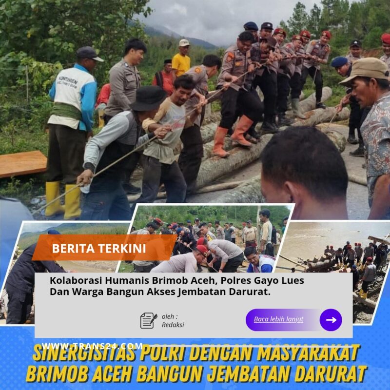 GAYO LUES//trans24.id – Wujud kepedulian dan sinergi dalam membantu masyarakat kembali ditunjukkan oleh Satuan Brimob Polda Aceh. Personel Kompi 4 Batalyon C Pelopor bersama Polres Gayo Lues dan masyarakat setempat melaksanakan kegiatan pembuatan jembatan darurat di Desa Penomon Jaya, Kecamatan Rikit Gaib, Kabupaten Gayo Lues, Kamis (19/12/2025).