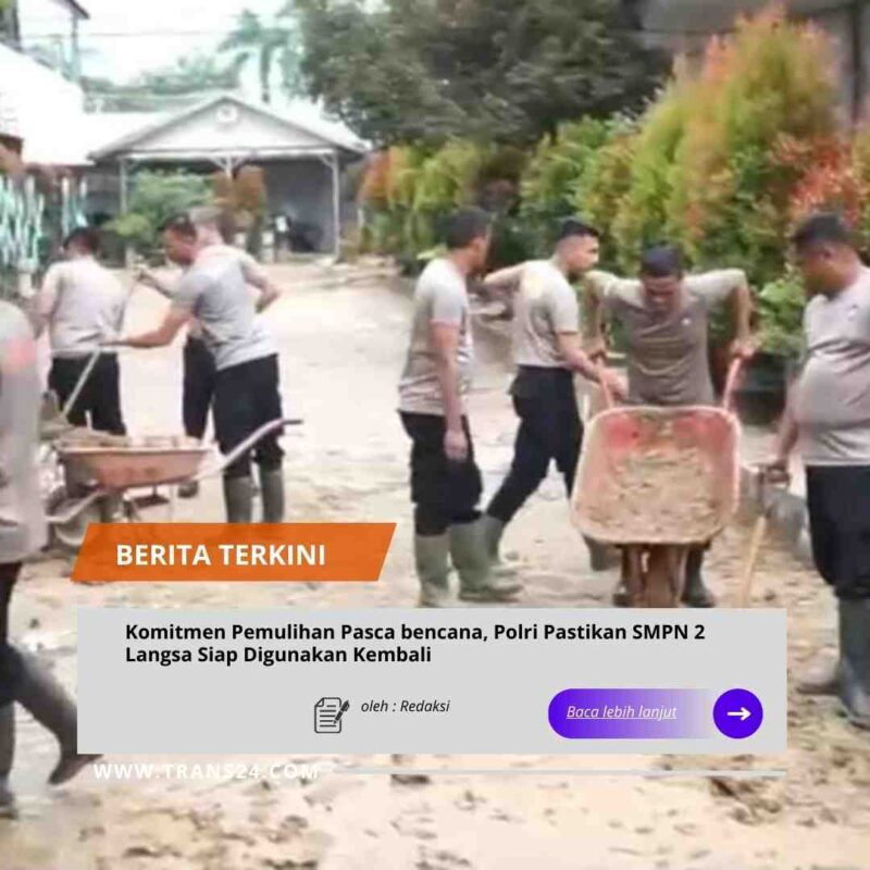 Langsa//trans24.id – Kepolisian Negara Republik Indonesia (Polri) kembali menegaskan komitmennya dalam pemulihan pascabencana alam, khususnya pada sektor pendidikan. Melalui aksi kemanusiaan, personel Polres Langsa bersama Dewan Guru SMP Negeri 2 Langsa melaksanakan kegiatan bakti sosial pembersihan lingkungan sekolah yang terdampak banjir di Kota Langsa, Provinsi Aceh.