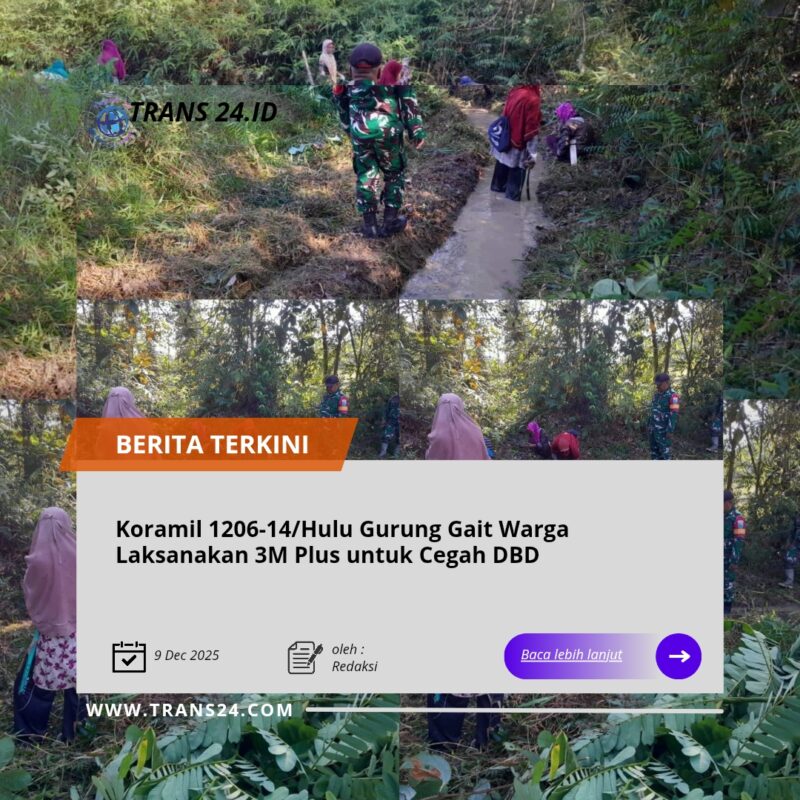Kapuas Hulu, Kalimantan Barat//trans24.id — Dalam rangka mencegah penyebaran penyakit Demam Berdarah Dengue (DBD) di musim pancaroba, Koramil 1206-14/Hulu Gurung, Kodim 1206/Putussibau, melaksanakan kegiatan gerakan kebersihan lingkungan dan sosialisasi 3M Plus bersama warga Desa Landau Kumpang Kecamatan Hulu Gurung, pada hari rabu ,10/12/25.