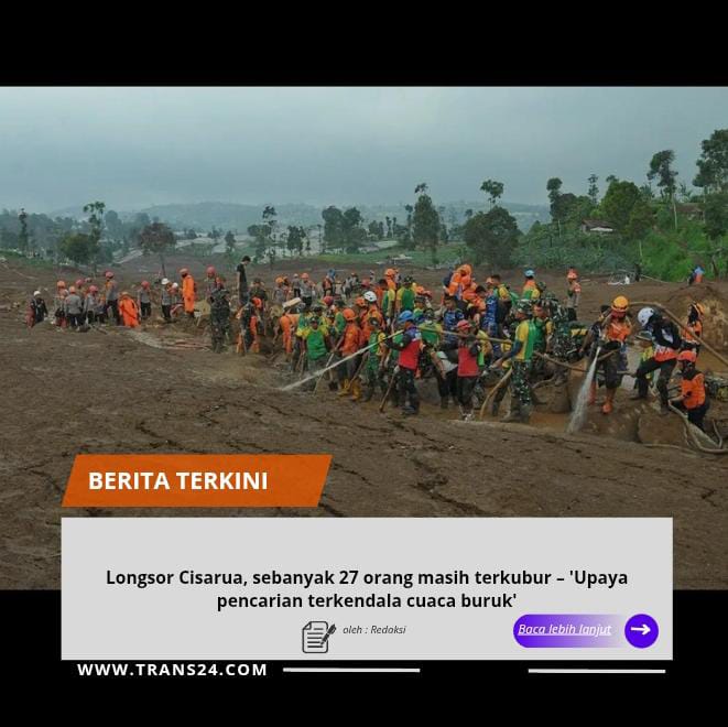 Bandung, // trans24.id //-Upaya pencarian 27 orang yang masih terkubur di Desa Cisarua, Kabupaten Bandung Barat, Jawa Barat, Kamis (29/01), masih terkendala cuaca buruk dan medan yang labil, kata Basarnas.
