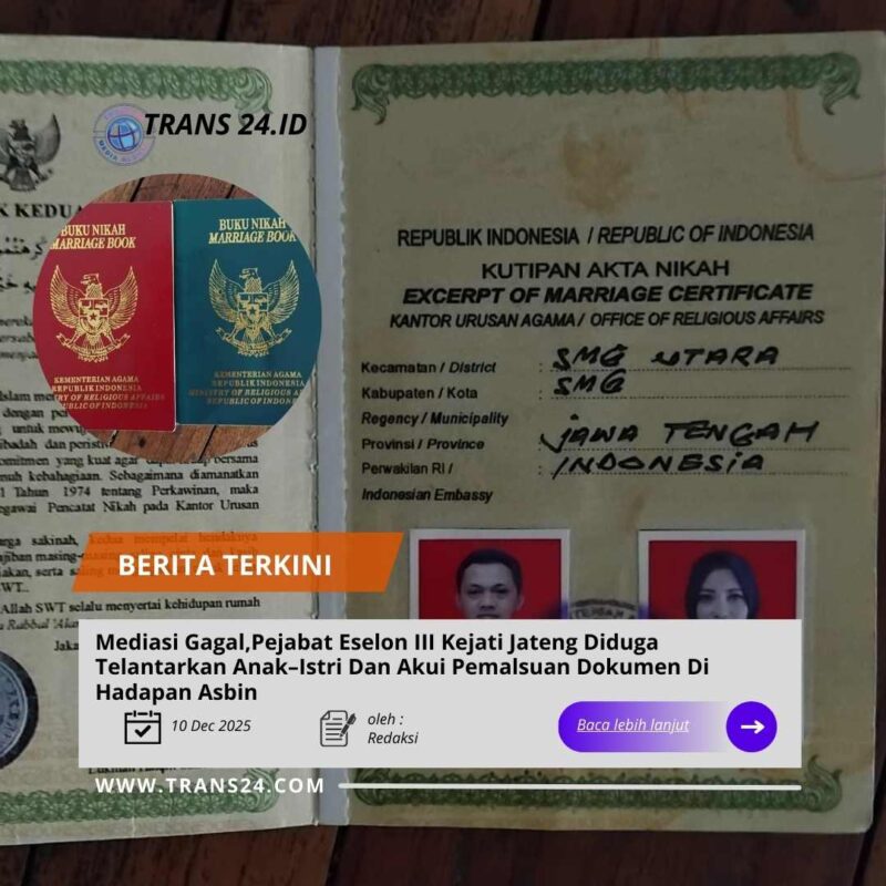 Semarang//trans24.id – 11/12/2025 – Proses mediasi antara pejabat eselon III Kejaksaan Tinggi Jawa Tengah berinisial AK dan istri sirinya SI akhirnya tidak menemukan titik temu.