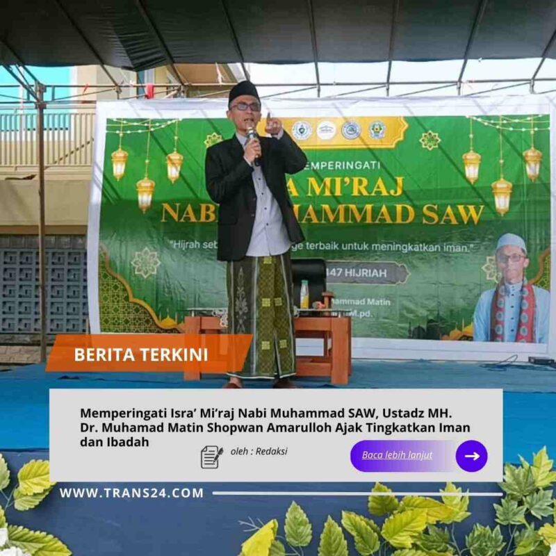 CIPARAY, BANDUNG, // trans24.id //- Hari ini, Senin, 19 Januari 2026, peringatan Isra’ Mi’raj Nabi Muhammad SAW digelar di Lapangan Geraha Wirakarya, Desa Magung Harja, Kecamatan Ciparay, Kabupaten Bandung. Kegiatan ini menghadirkan Ustadz MH. Dr. Muhamad Matin Shopwan Amarulloh, M.Pd., yang memberikan tausiyah dengan tema “Hijrah untuk Meningkatkan Iman kepada Umat”.
