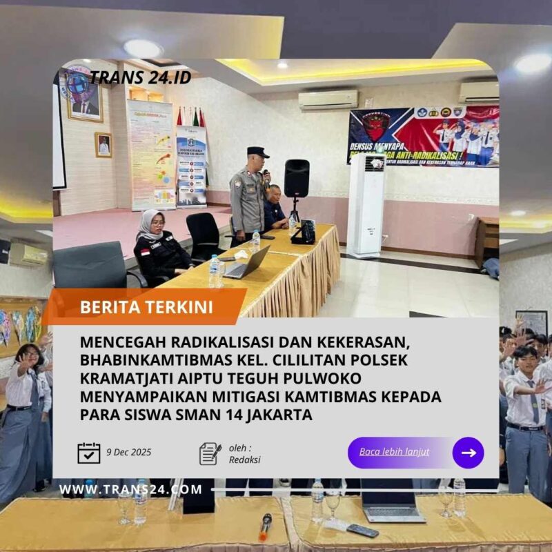 Jakarta//trans24.id – Dalam upaya mencegah radikalisme dan kekerasan di kalangan anak, Bhabinkamtibmas Kel. Cilititan Polsek Kramatjati Aiptu Teguh Pulwoko mengadakan kegiatan mitigasi kamtibmas kepada para siswa SMAN 14 Jakarta.