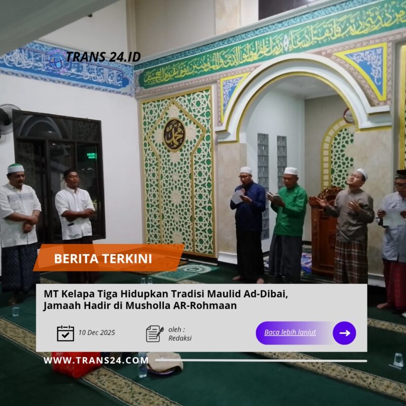 BOGOR//trans24.id — Majelis Taklim (MT) Kelapa Tiga kembali menggelar pengajian rutin pembacaan Rawi Maulid Ad-Dibai pada Kamis malam Jumat, 11 Desember 2025, di Musholla AR-Rohmaan, Jalan KH. Abdurrahman Al-Amsari, Kampung Kelapa Tiga RW 04, Kelurahan Mekarwangi, Kecamatan Tanah Sareal, Kota Bogor.