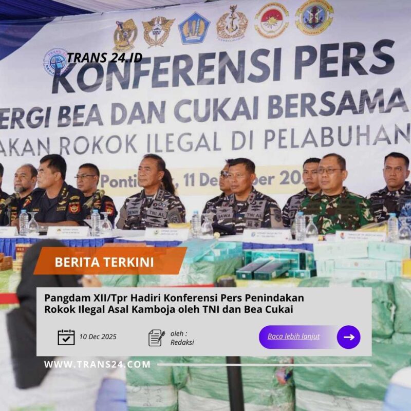 PONTIANAK//trans24.id – Pangdam XII/Tanjungpura Mayjen TNI Jamallulael menghadiri Konferensi Pers Sinergi Bea Cukai Bersama TNI Angkatan Laut Penindakan Rokok Ilegal di Pelabuhan Dwikora, Kota Pontianak pada Kamis (11/12/2025). Konferensi pers dipimpin Direktur Jenderal Bea dan Cukai Letjen TNI (Purn) Djaka Budhi Utama.