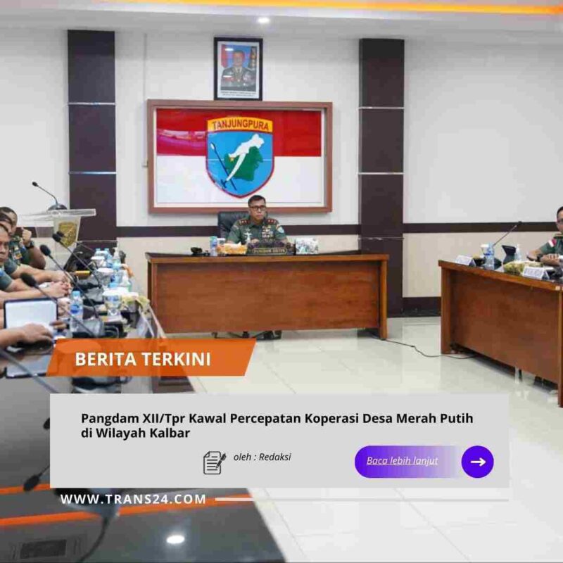 KUBU RAYA, // trans24.id // – Panglima Kodam XII/Tanjungpura, Mayjen TNI Novi Rubadi Sugito, S.I.P., M.Si., menegaskan komitmen jajarannya dalam mendukung penguatan ekonomi desa. Hal ini disampaikan usai mengikuti Rapat Evaluasi Percepatan Koperasi Desa/Kelurahan Merah Putih (KDKMP) secara virtual dari Ruang Yudha, Makodam XII/Tpr, Selasa (20/1/2026).