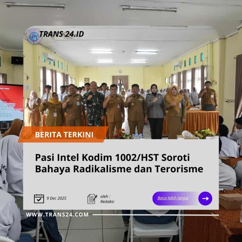 BARABAI//trans24.id – Komitmen memperkuat nilai kebangsaan terus diperkuat di Kabupaten Hulu Sungai Tengah. Pasi Intel Kodim 1002/HST, Kapten Inf Lilis Susanto, menjadi narasumber dalam kegiatan sosialisasi bertema “Radikalisme dan Terorisme sebagai Ancaman Kebhinekaan” yang digelar oleh Badan Kesatuan Bangsa dan Politik (Kesbangpol) HST di Aula SMA Negeri I Hulu Sungai Tengah, Selasa (09/12/2015).