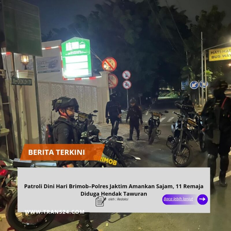 Jakarta, // trans24.id //— Patroli skala besar Brimob Polda Metro Jaya bersama Polres Metro Jakarta Timur membuahkan hasil dengan menggagalkan rencana tawuran di wilayah Jakarta Timur. Patroli cipta kondisi yang digelar sejak Senin malam hingga Selasa dini hari, 27 Januari 2026, itu menyasar sejumlah titik rawan tawuran, balap liar, dan kejahatan jalanan.