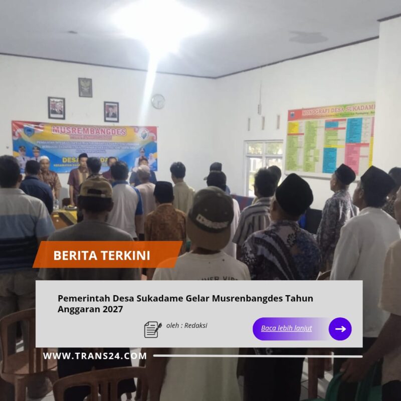 Pandeglang, // trans24.id // Pemerintah Desa Sukadame, Kecamatan Pagelaran, Kabupaten Pandeglang, Provinsi Banten, menggelar Musyawarah Perencanaan Pembangunan Desa (Musrenbangdes) Tahun Anggaran 2027 dengan tema Penguatan Integrasi Infrastruktur Prioritas dan Potensi Unggulan Berbasis Ekonomi Lokal, Peningkatan Kualitas Sumber Daya Manusia serta Tata Kelola Pemerintahan yang Profesional.kamis (22/1/2026).