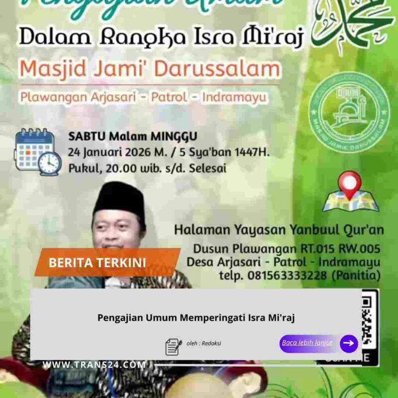 Indramayu, // trans24.id //-Acara pengajian umum dalam rangka memperingati Isra Mi’raj ini akan diselenggarakan di Masjid Jami’ Darusalam, yang terletak di halaman Yayasan Yanbuul Qur’an, Kecamatan Patrol, Kabupaten Indramayu.